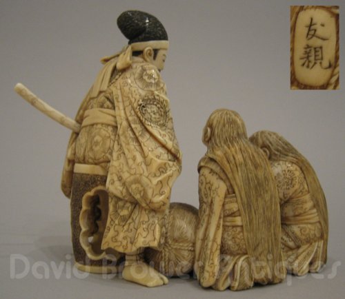 A fine Japanese ivory group of seated Samurai with 2 women at David Brower Antiques, London-based dealer in 19th century antiques